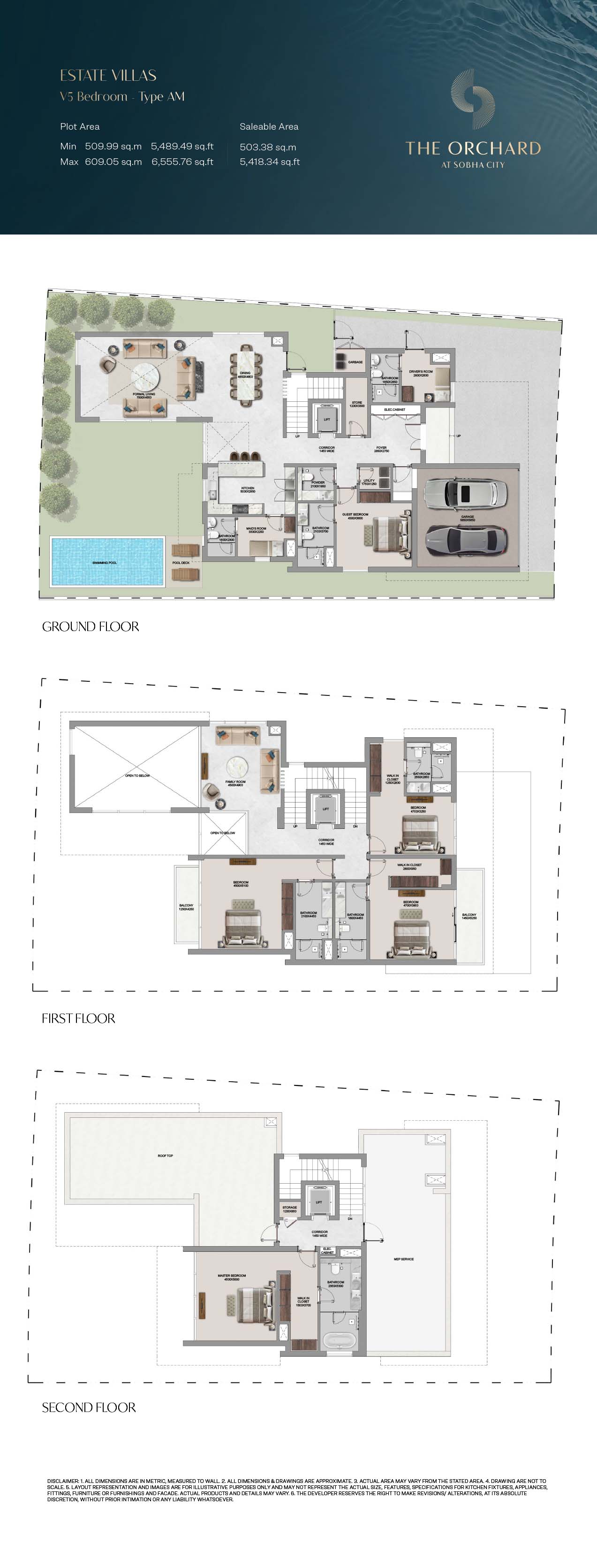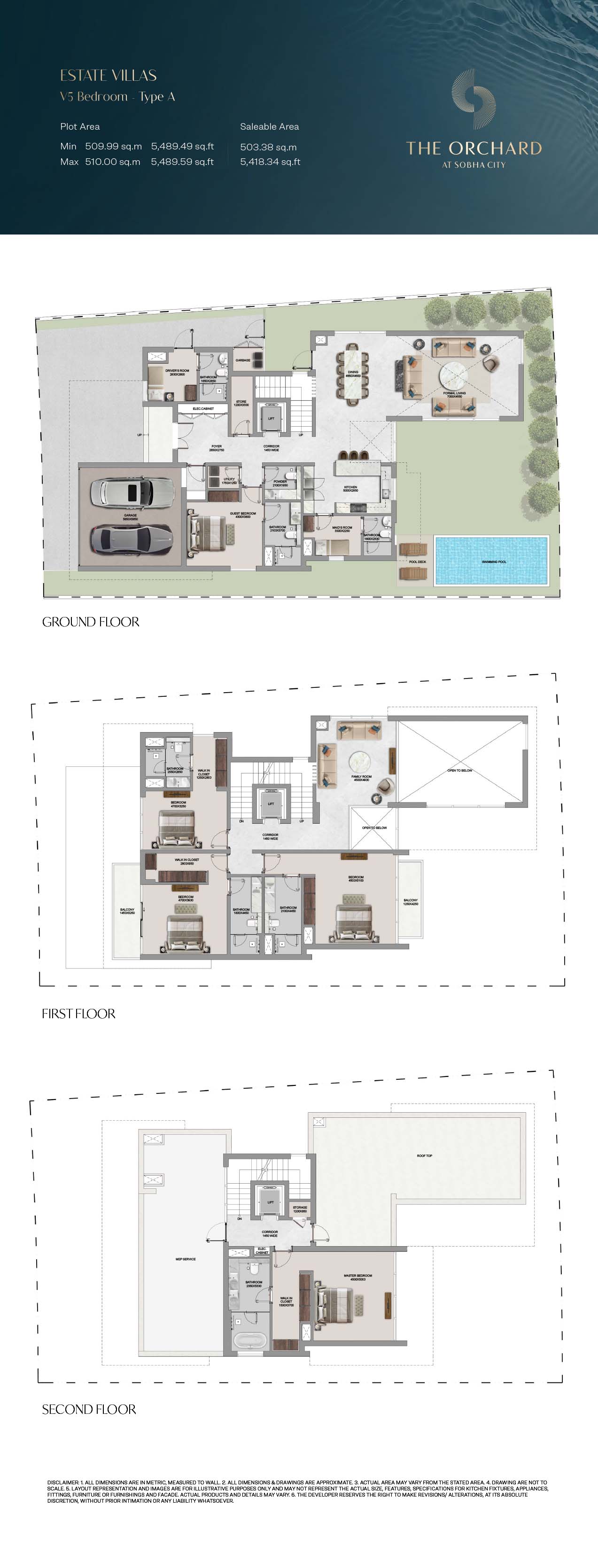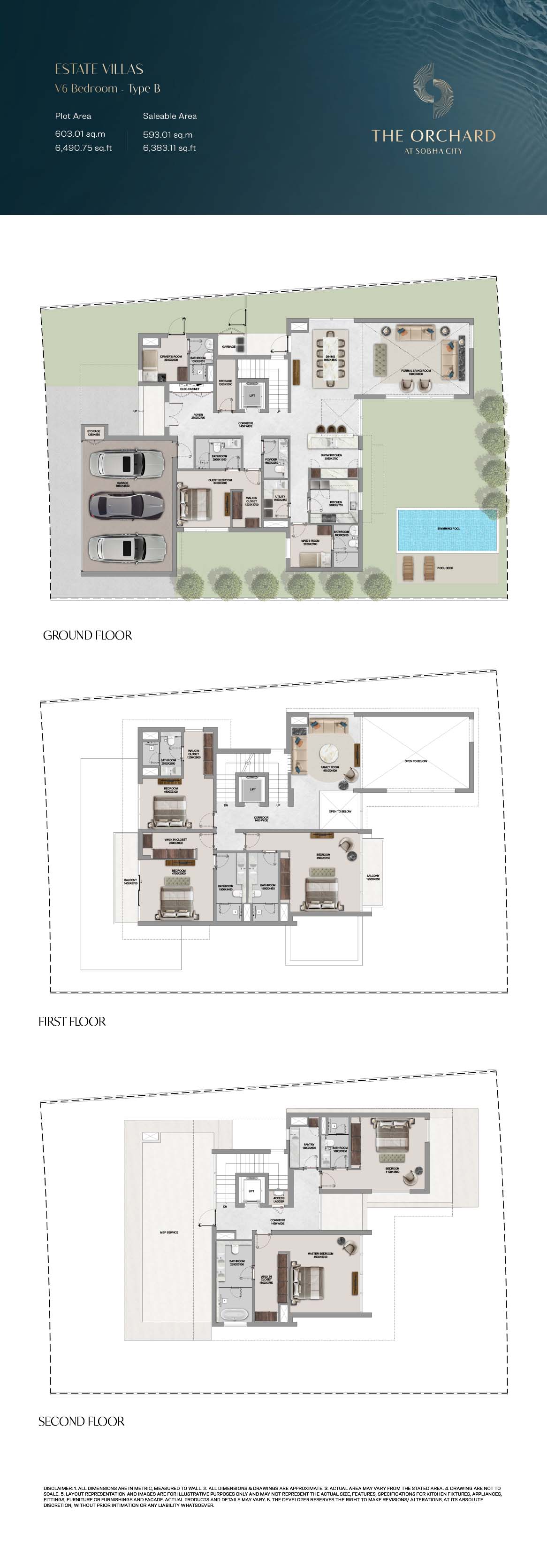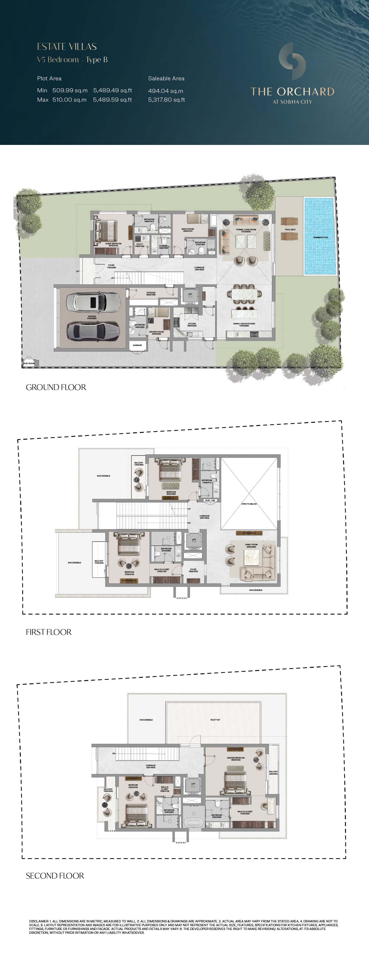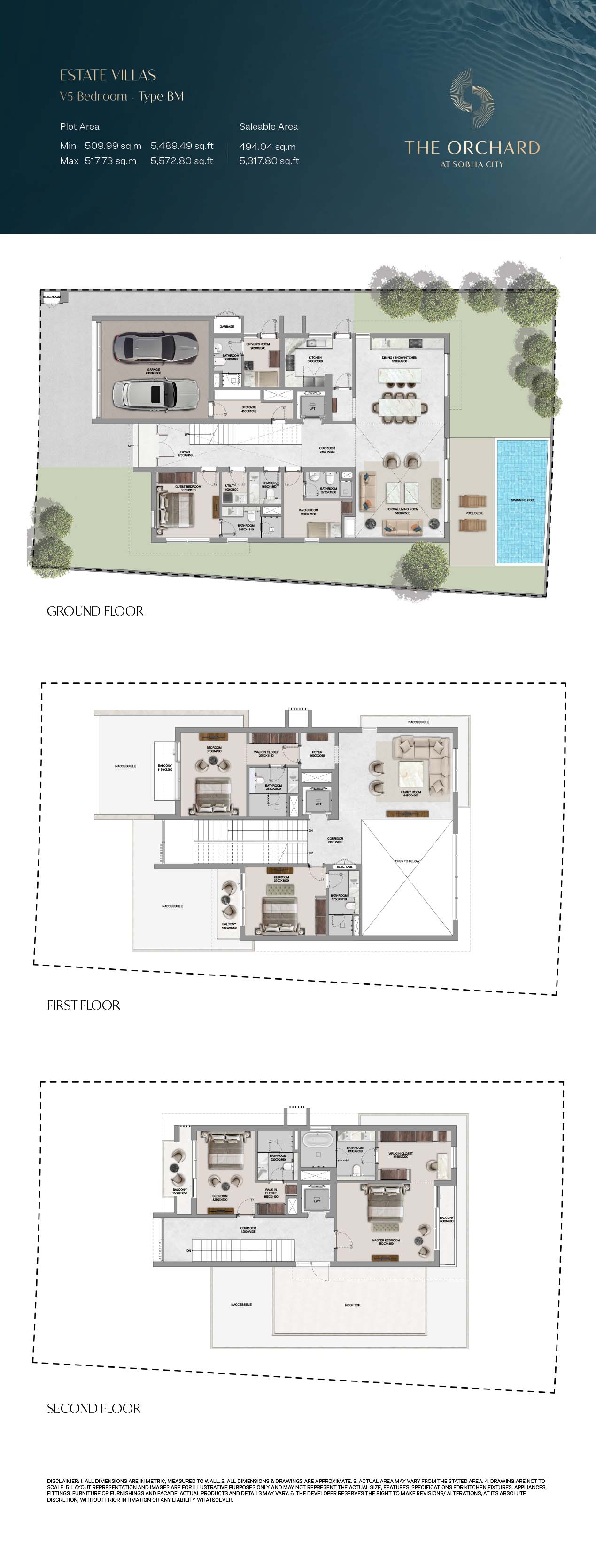 The Orchard floor plans are detailed so as to give maximum attention on space optimization, lined with 4, 5 and 6-bedroom Estate Villas. The villas have clearly separated spaces, such as large living rooms, formal and family rooms, guest suites, and bedroom suites, with a smooth transition between common and private space. There is dual height ceilings and wide size windows that contribute to greater space perception and natural light. The functional items like the lifts, utility rooms and maid quarters are cleverly incorporated to accommodate the modern life styles. Extensions outdoor, such as private pools, landscaped gardens and balconies, complement the interiors offering the entire living experience that balances between the privacy and openness.