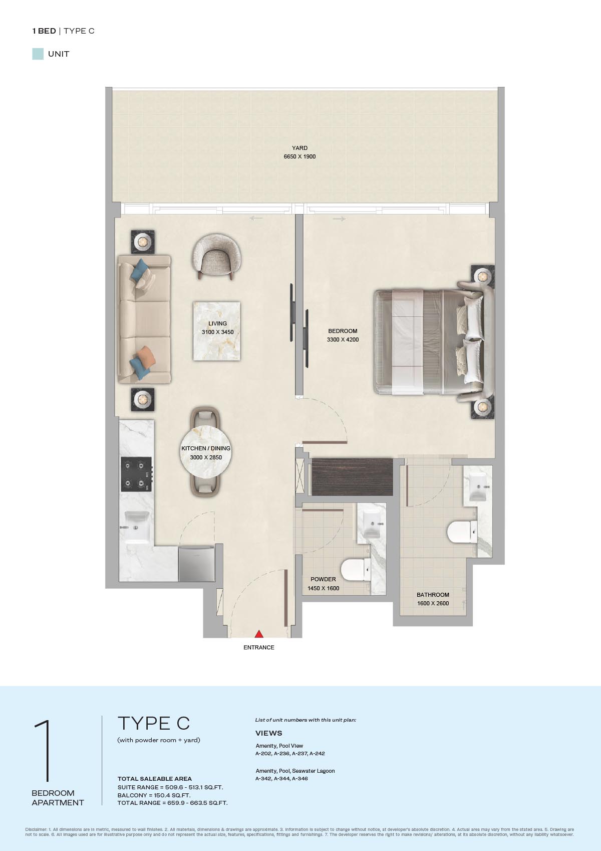 | Tower A | 1 Bedroom | Typical Layout - Level 02 & 03 (Type C) | 663.50 Sq Ft | Click Here |
