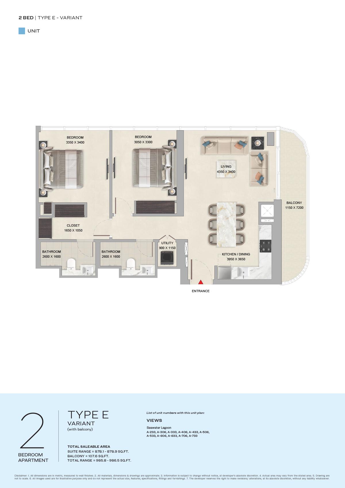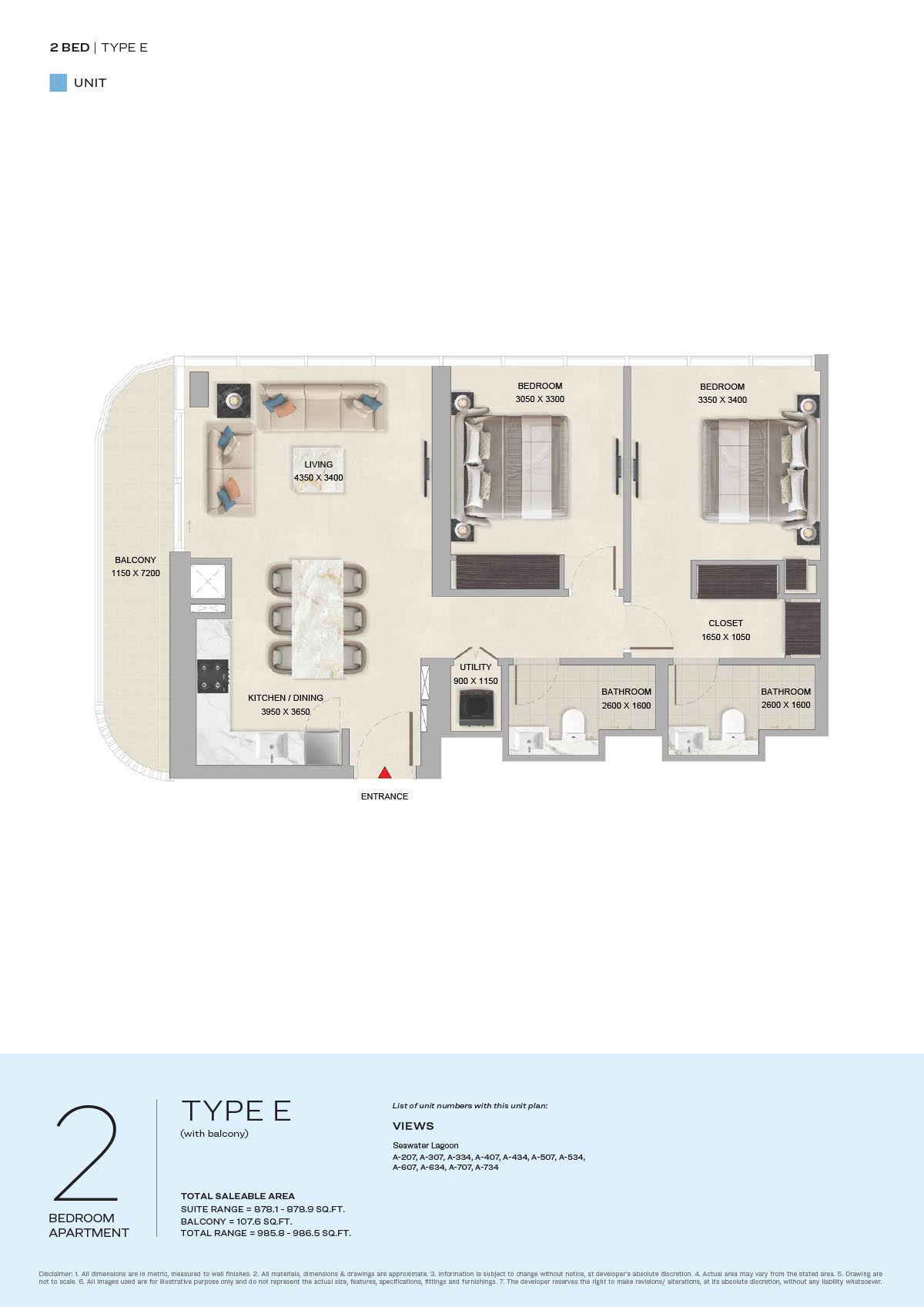| Tower A | 2 Bedrooms | Typical Layout - Level 04 To 07 (Type E Variant) | 986.50 Sq Ft | Click Here |