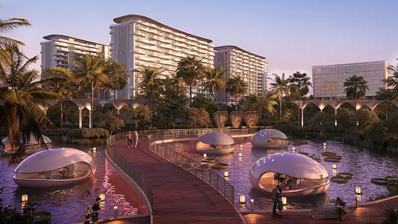 - Architectural design features soft curves, layered balconies, and wave-like forms that create visual harmony between buildings and lagoon landscapes.