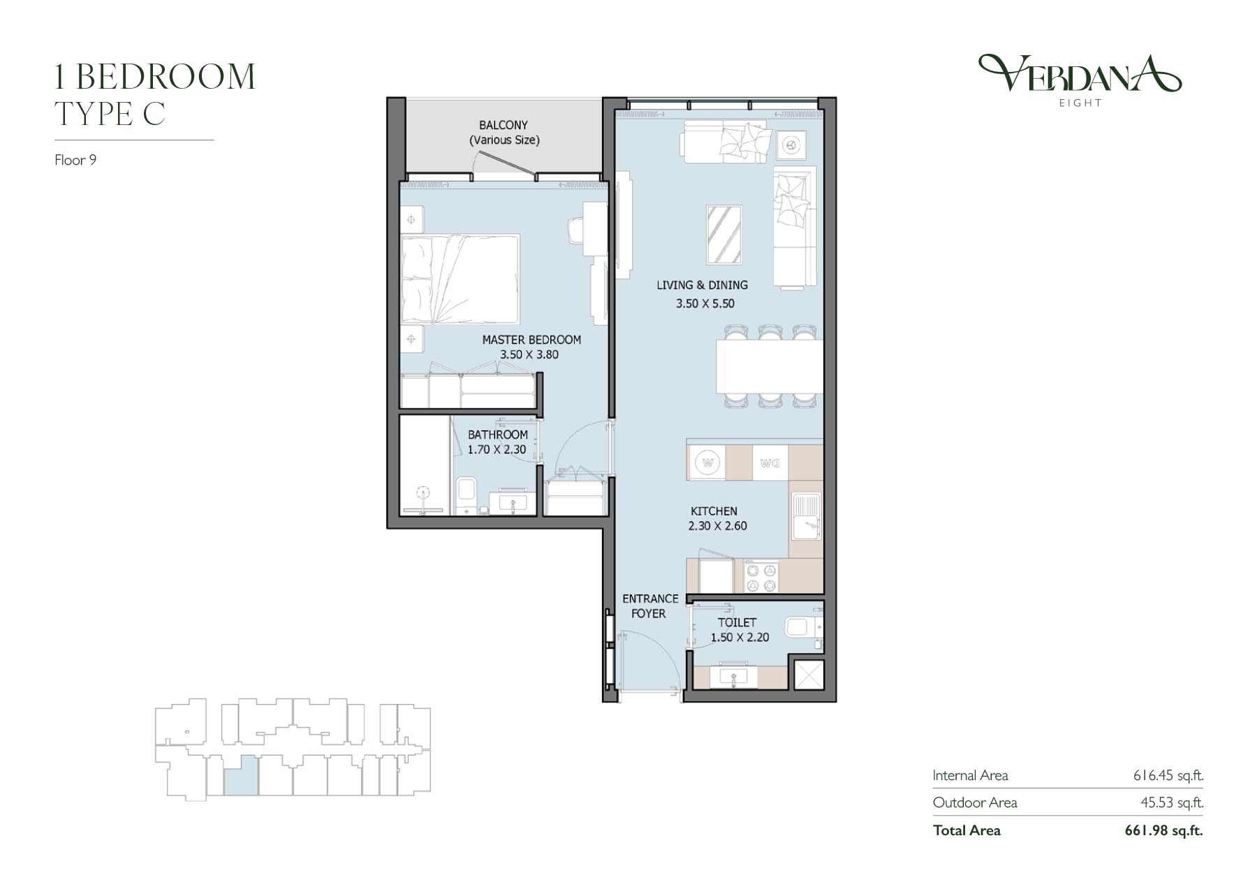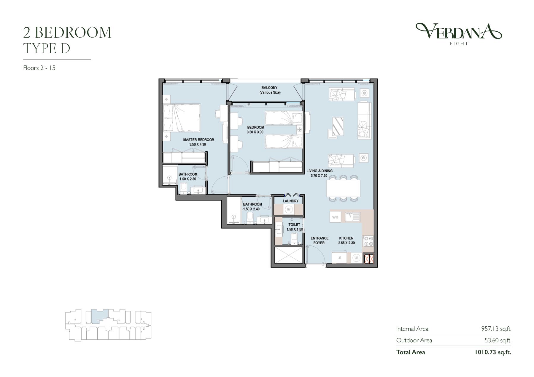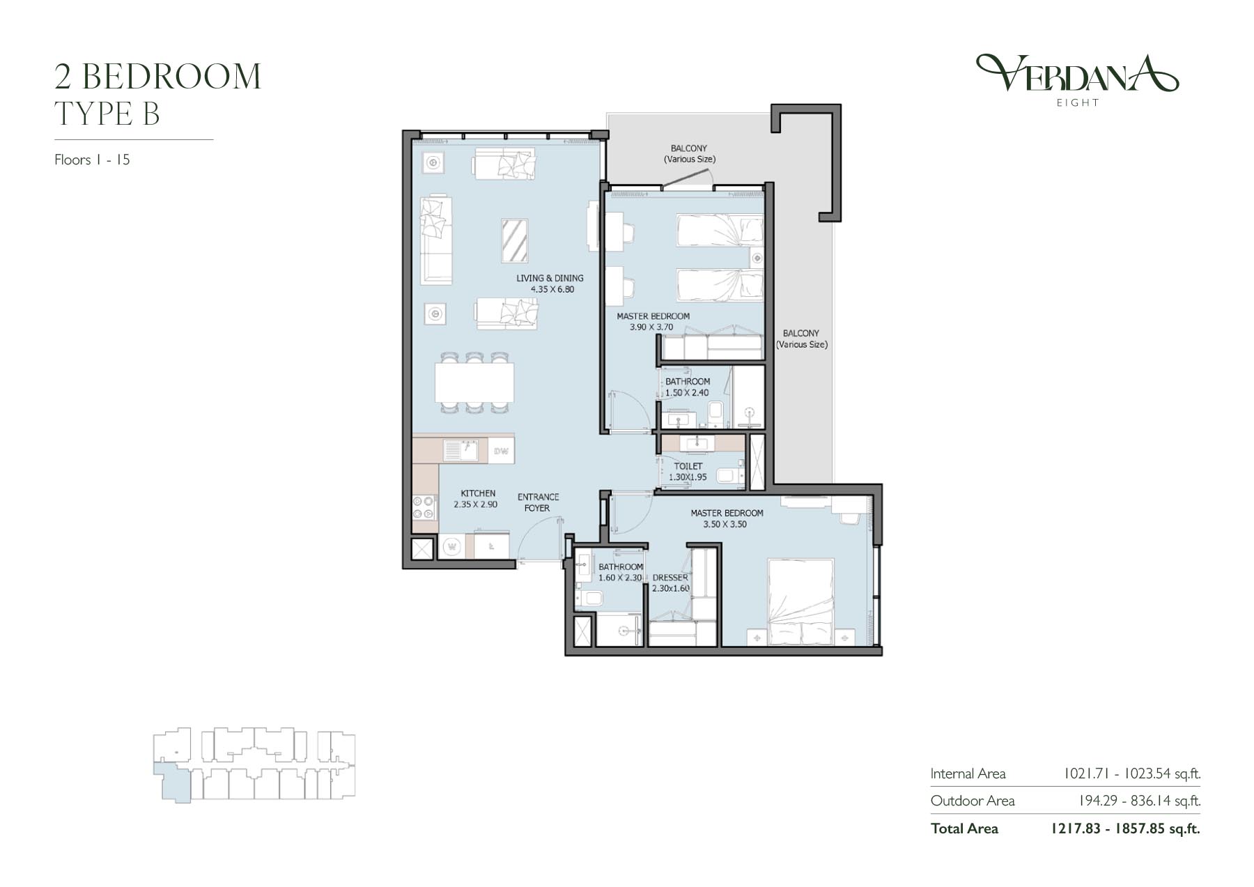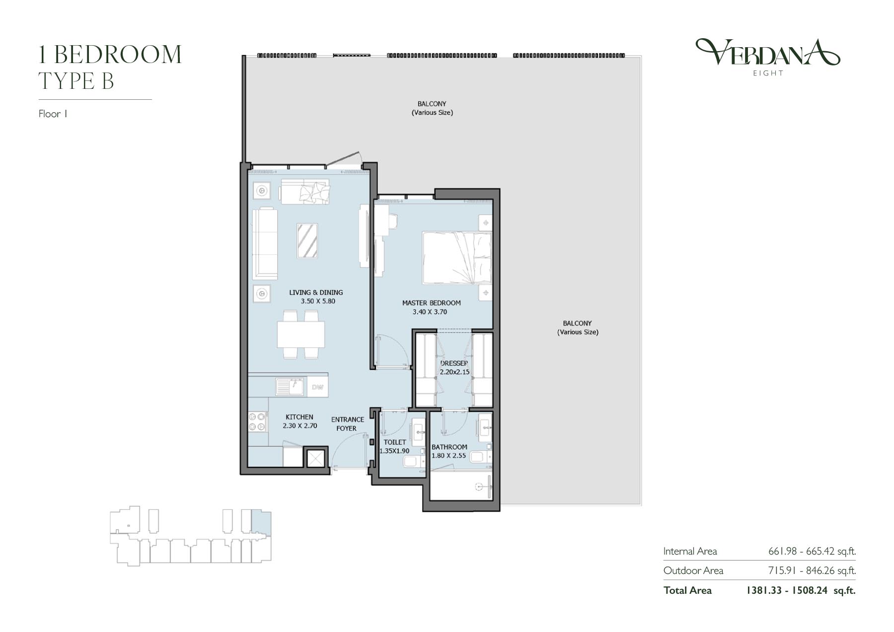 Verdana 8 floor plans have been designed keeping versatility, style, and lifestyle with studios, 1 & 2-bedroom apartments and 2 to 4-bedroom townhouses. The homes are in the forms of studios up to four-bedroom townhouses which are designed in a wise manner to be able to make use of natural lighting and usability. Studio sizes suits young professionals, and one bedroom have modern open-plan designs that are suitable to couples. All houses will have efficient bathrooms, complete tiles, vanity units and inbuilt wardrobes- it is functional and very subtle on design. The townhouses come with select houses and maid room and laundry at the expense.