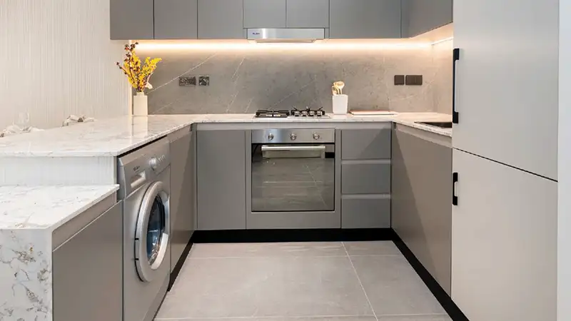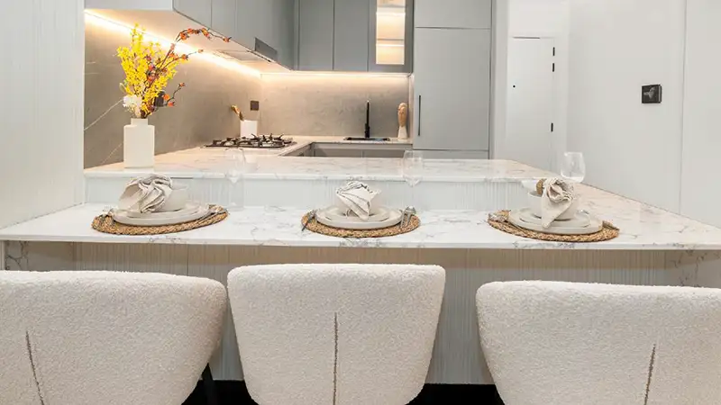 - Fully fitted kitchens featuring premium finishes and white appliances.