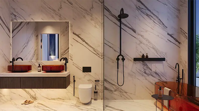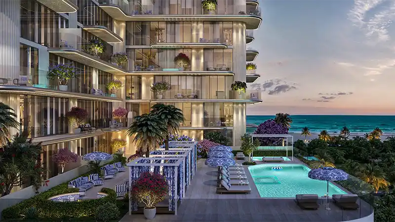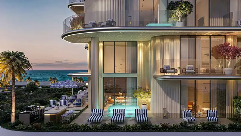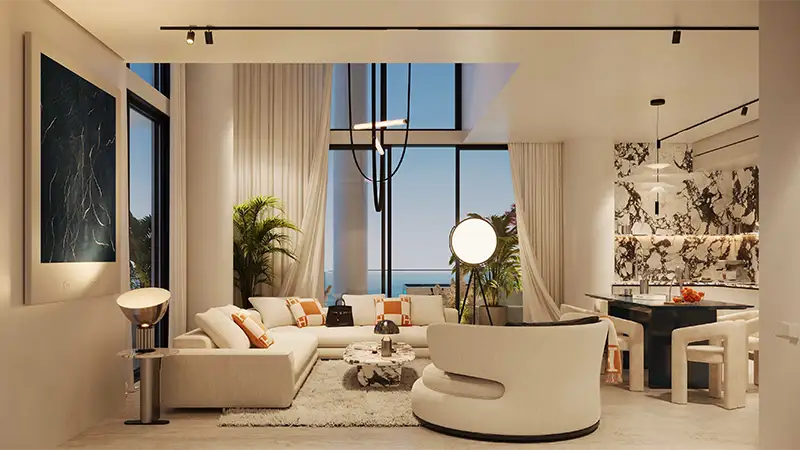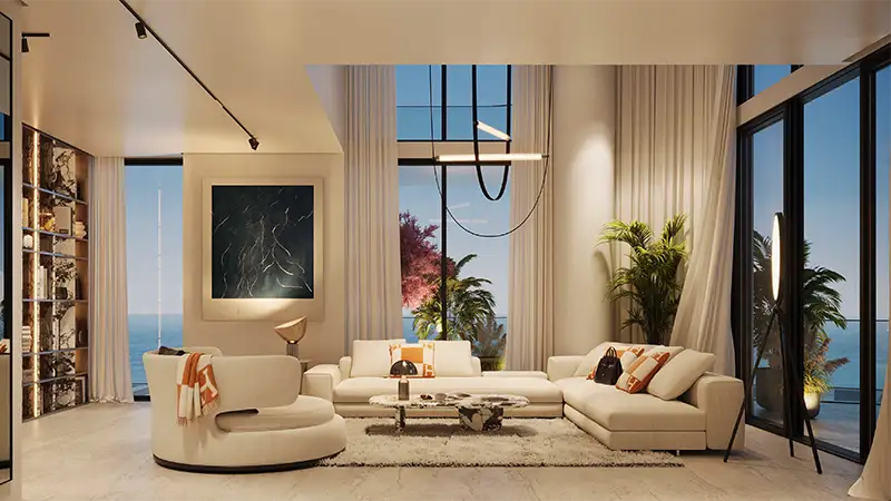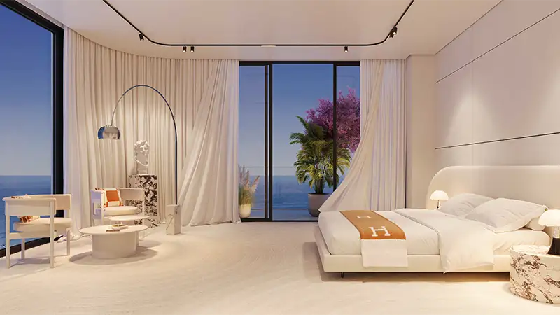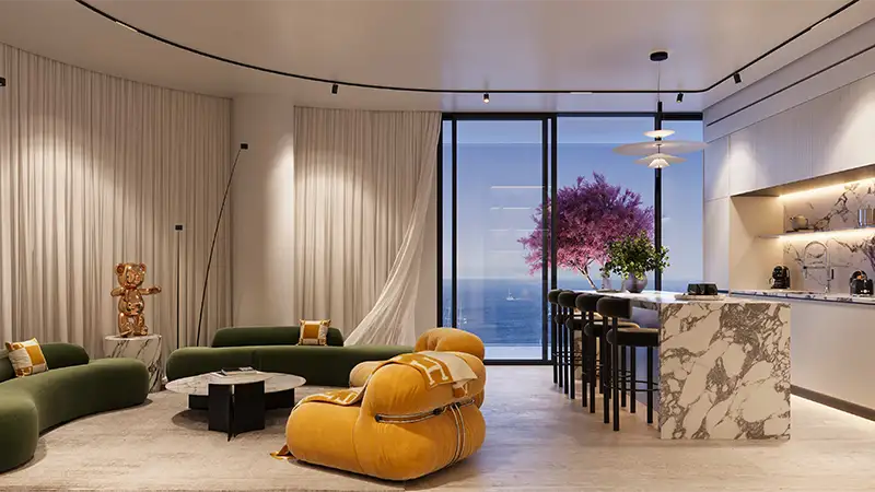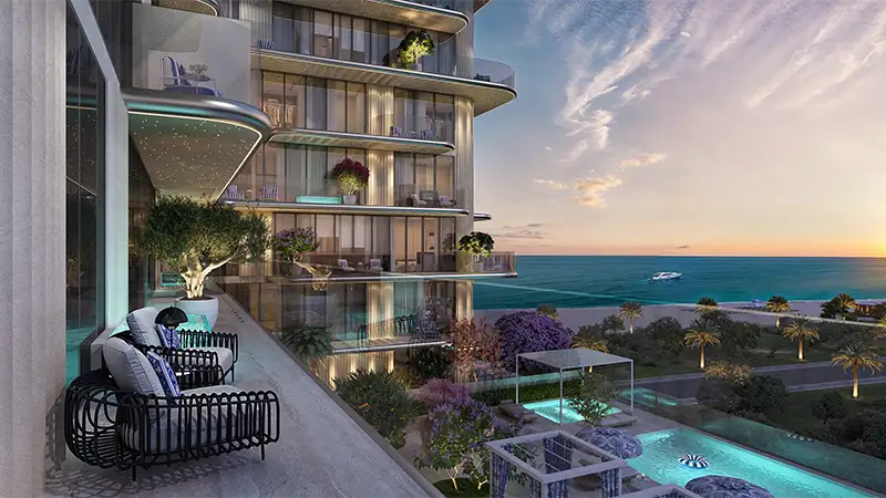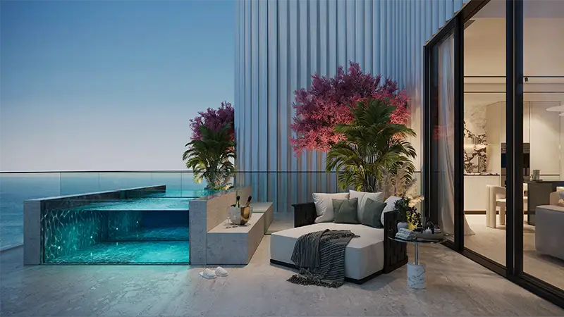 - Private balconies and terraces designed as extended living spaces overlooking sea and skyline.