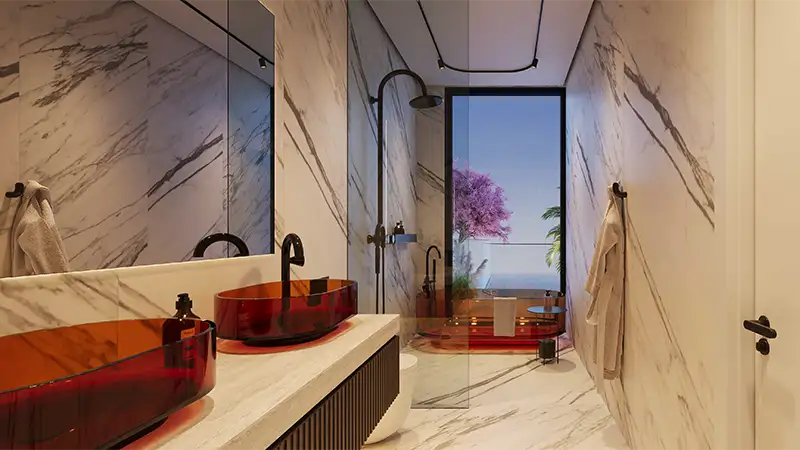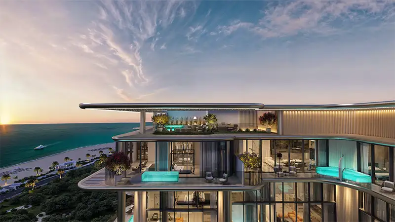 - Sculpted façade with warm materials, terraces and expansive glass design for uninterrupted sea views.